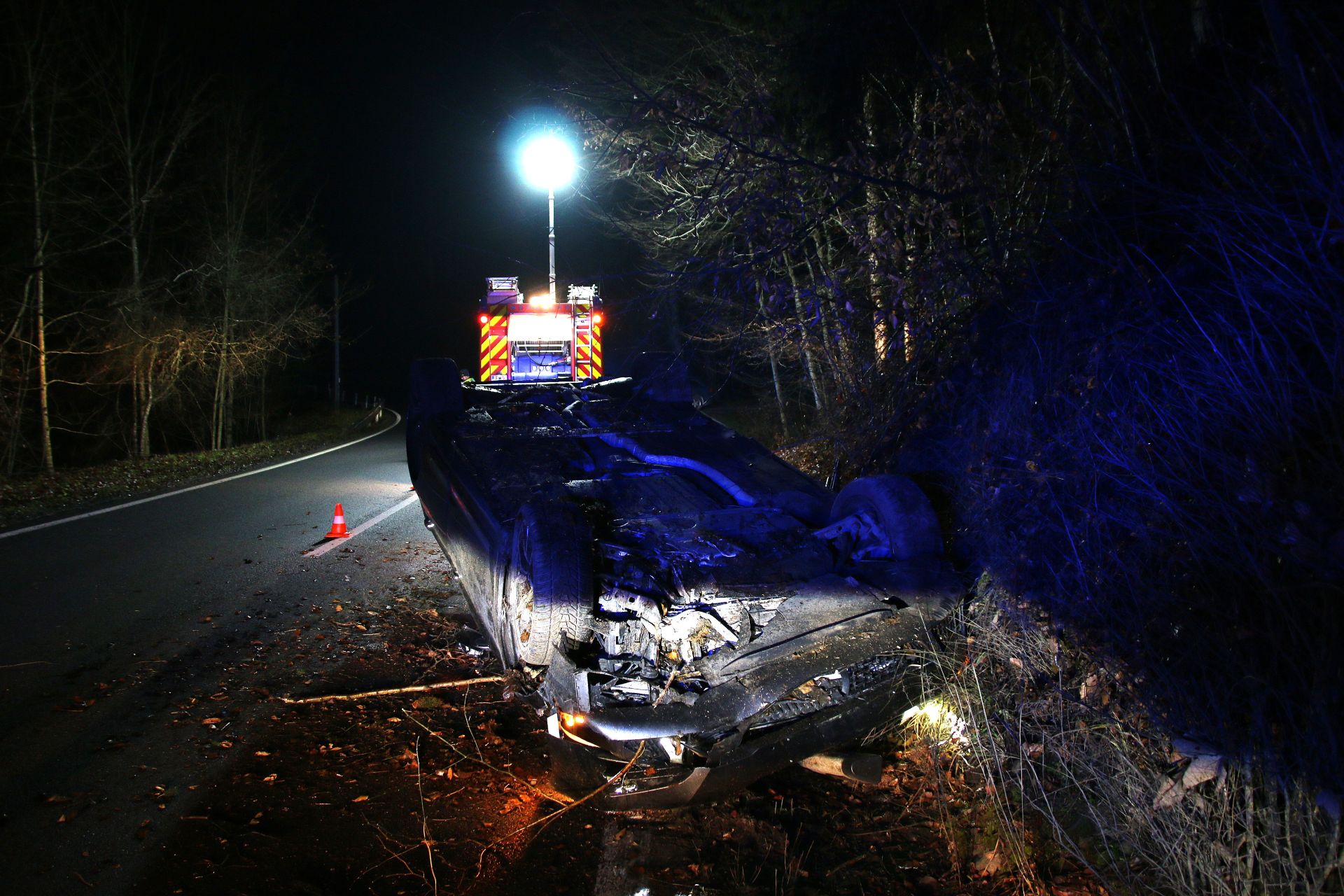 Ein PKW-Lenker kam auf der B130 bei Kilometer 17,8 in Fahrtrichtung Eferding in einer Kurve von der Fahrbahn ab, prallte gegen einen Baum und kam auf dem Dach liegend zum Stillstand.