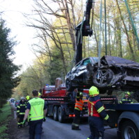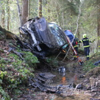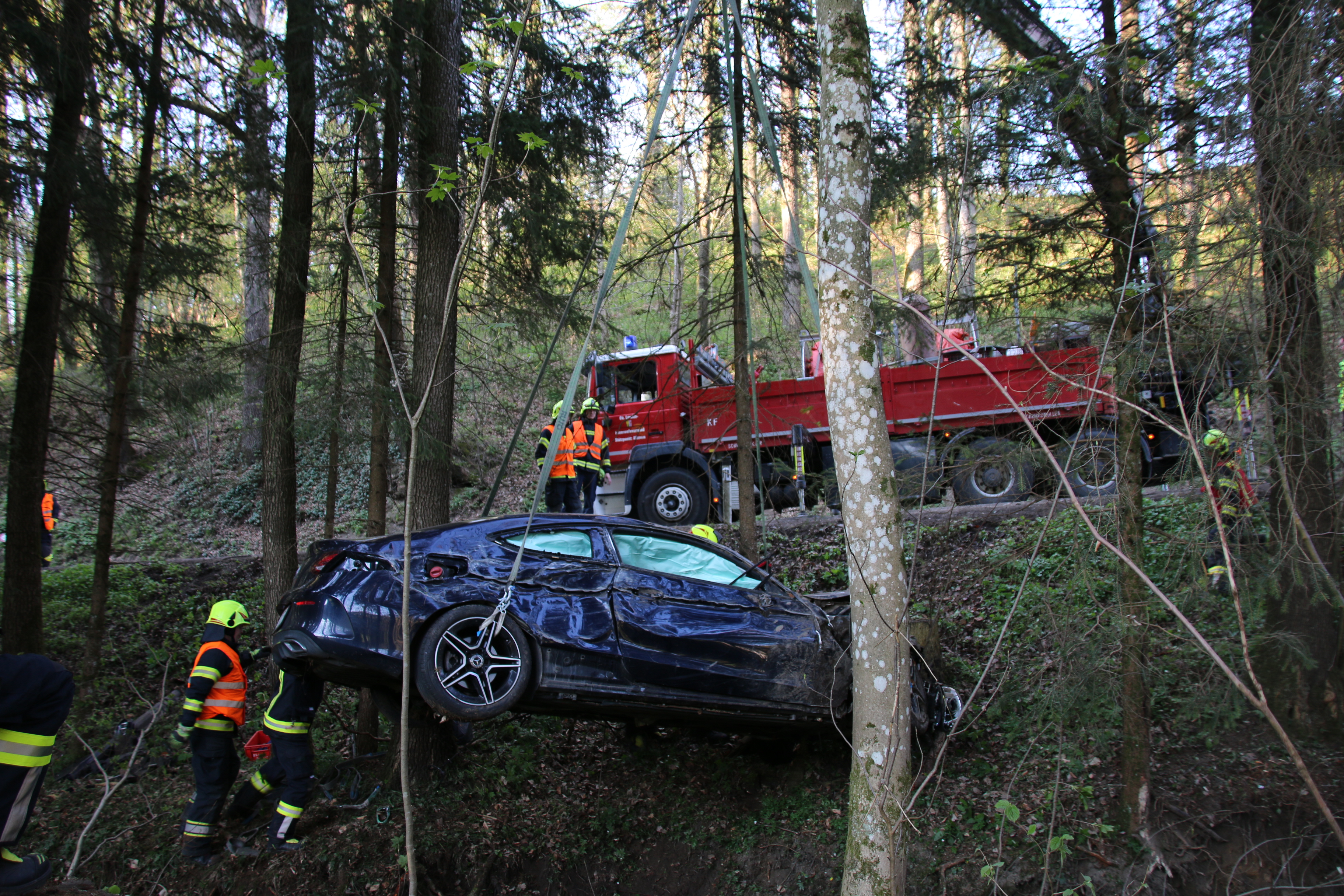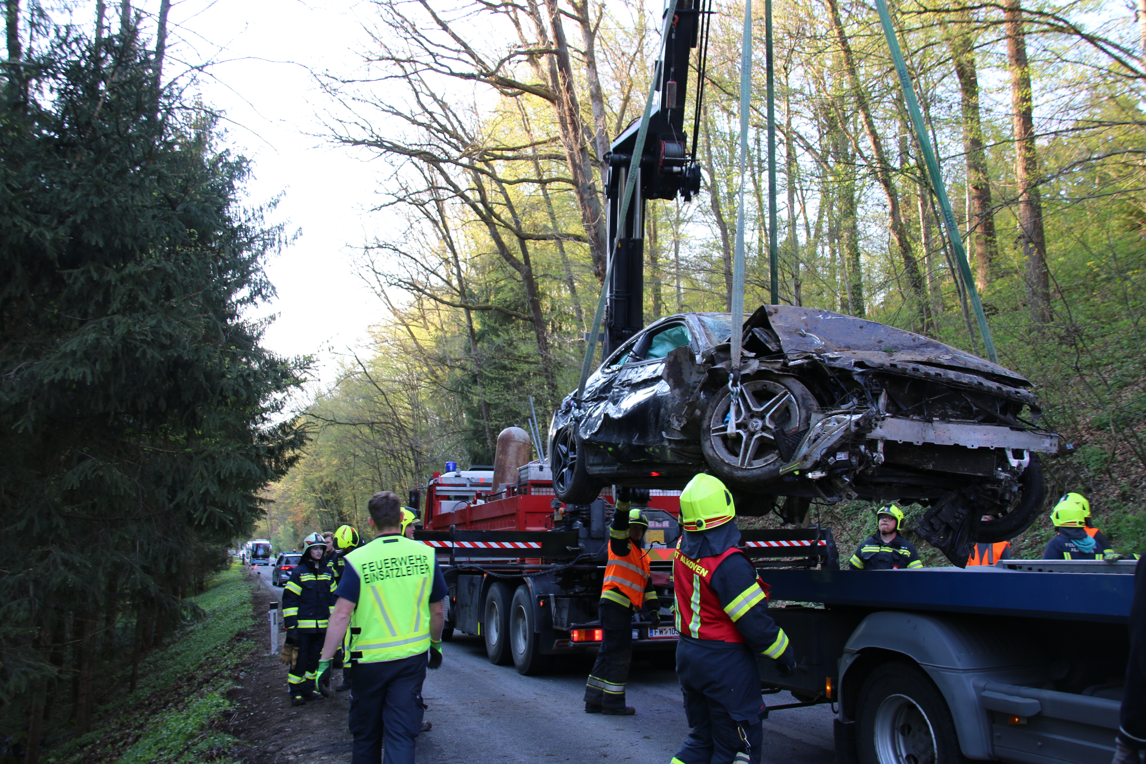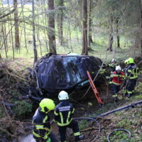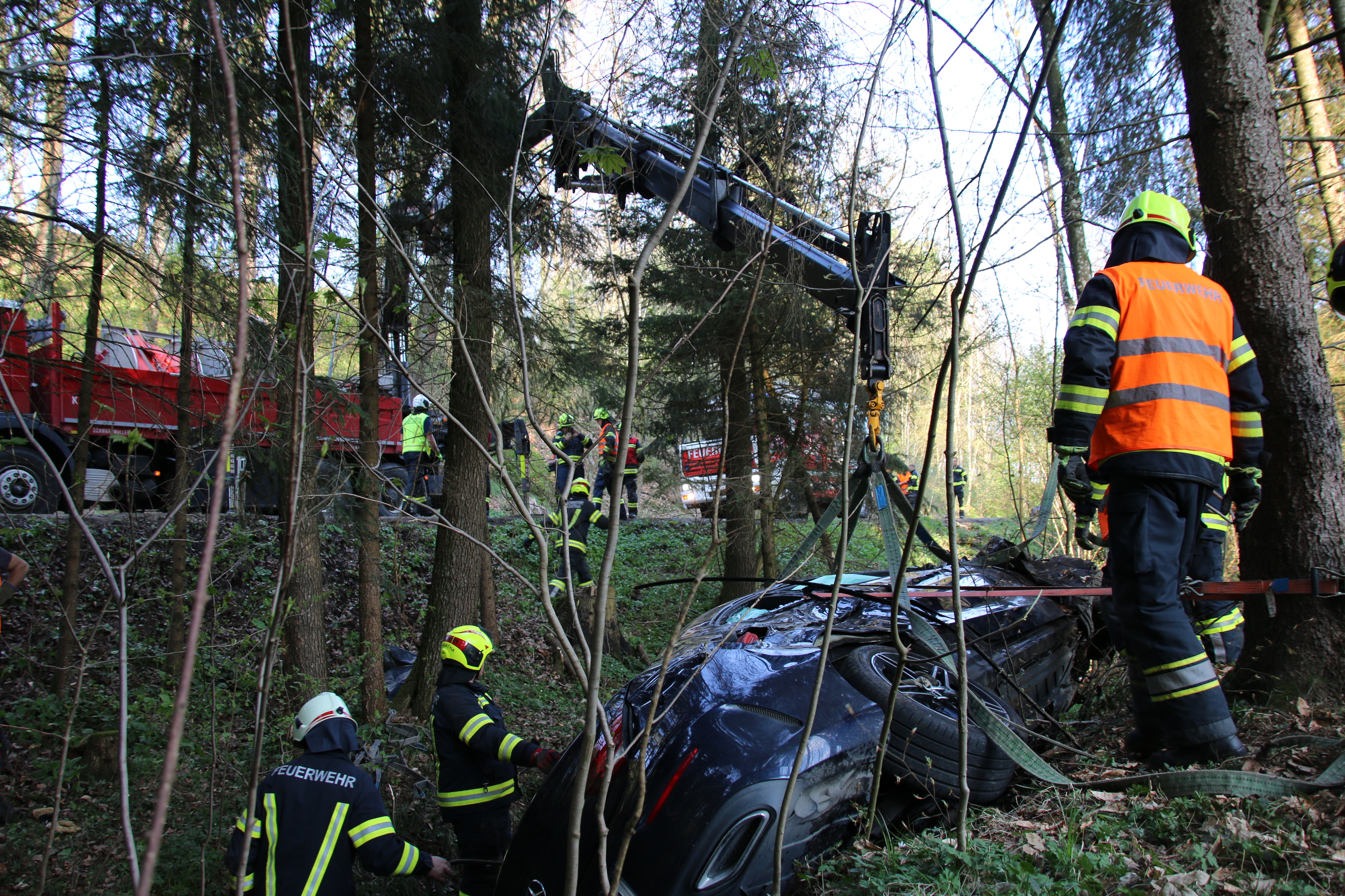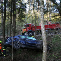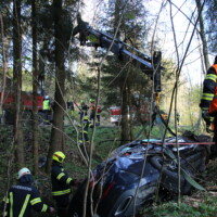Unsere weiteren Aufgaben bestanden darin die Fahrzeuge zu sichern, auslaufende Betriebsmittel zu binden und die Bergung des Fahrzeugs aus dem Bach durchzuführen – dazu wurde der Kran Alkoven nachalarmiert.